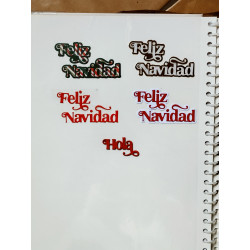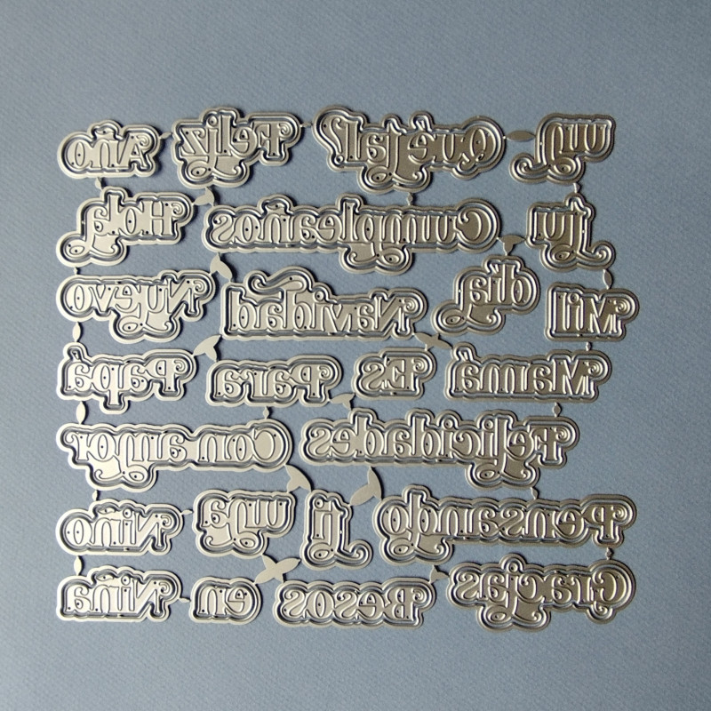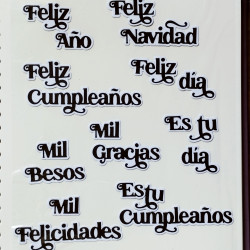 Se pueden recortar 27 palabras con este juego de troqueles: Feliz, Año, Qué tal?, un, tu, Hola, Cumpleaños, Navidad, Mil, día, Nuevo, Mamá, Papá, Para, Es, Felicidades, Con amor, Pensando, ti, una, Niña, Niño, Gracias, Besos, en