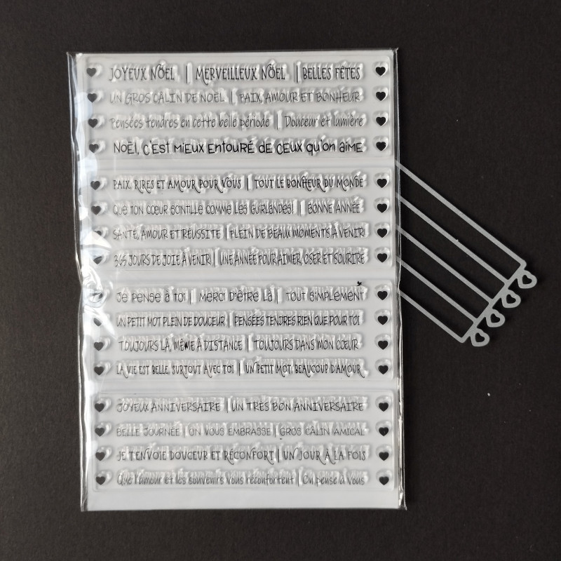 Tampons combinables entre eux, ils vous offrent des dizaines de possibilités de combinaison. Une façon créative, originale et personnalisée pour créer vos messages. Venez consulter le PDF avec quelques unes des combinaisons possibles ICI :