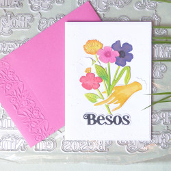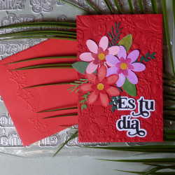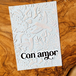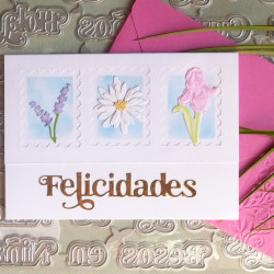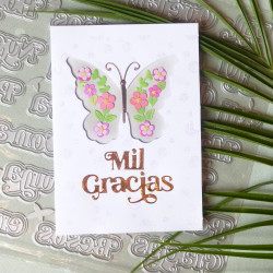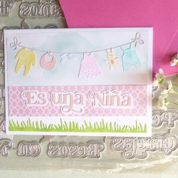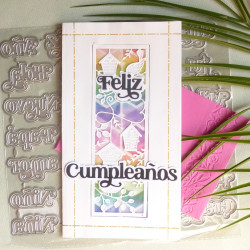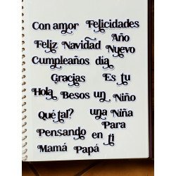 27 mots peuvent être découpés avec de set de matrices de découpe: Feliz, Año, Qué tal?, un, tu, Hola, Cumpleaños, Navidad, Mil, día, Nuevo, Mamá, Papá, Para, Es, Felicidades, Con amor, Pensando, ti, una, Niña, Niño, Gracias, Besos, en
