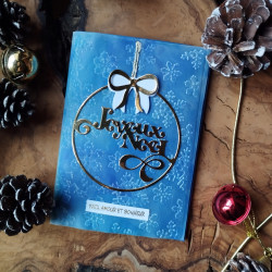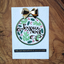 J'ai dessiné aussi ce set de dies et je suis très contente du résultat, on peut faire des cartes ou des tags de Noël avec, on peut aussi changer le message avec un message tamponné ou coller un message différent. Différentes techniques à essayer: inlay ou rhodoïd colorié, plein de possibilités pour des très jolis rendus! Par exemple, regardez la dernière carte ou j'ai uniquement utilisé le message Joyeux Noël en la découpant du cercle.